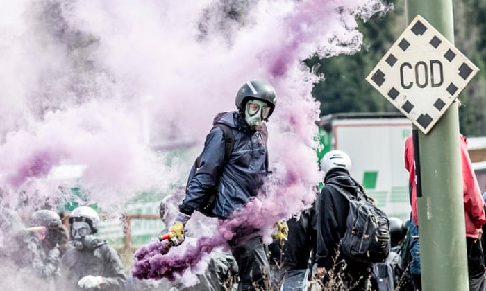 groups of protesters, their faces masked against the fumes, hurled
