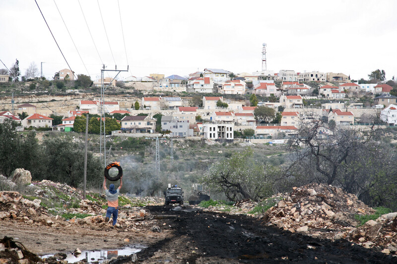 demonstrator in the West Bank village of Kafr Qaddum holds up a burning