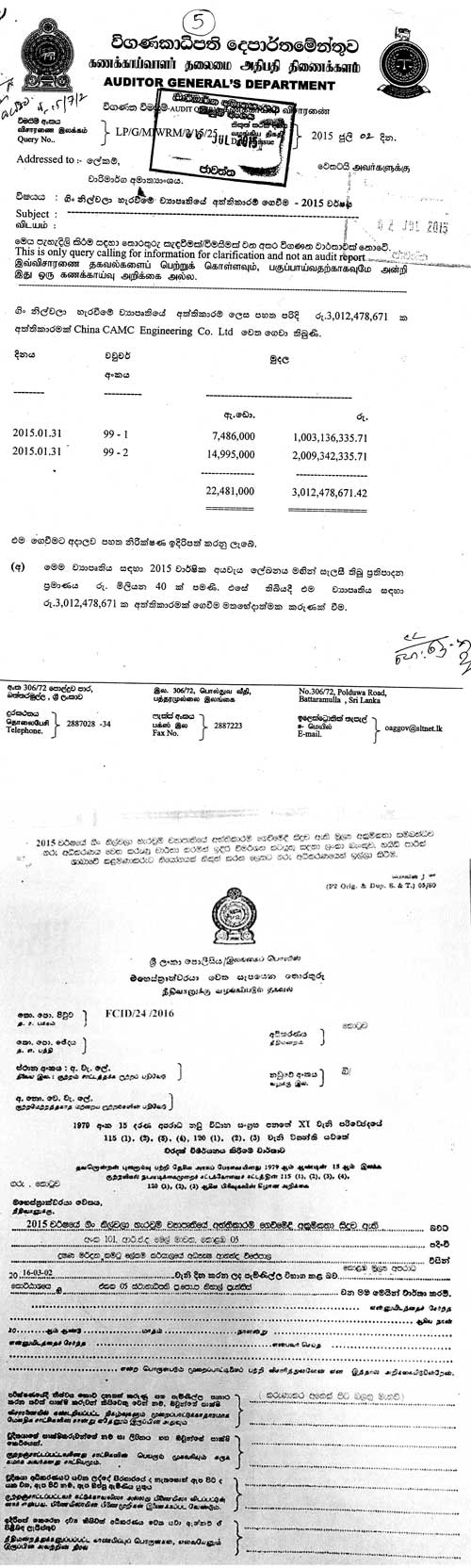 According to the ‘B’ report submitted to the Colombo Magistrate Court by the Financial Crimes Investigation Division (FCID) on November 28, 2016, the first installment worth Rs.1000 million had been paid by the Ministry Chief Accounting Officer Ivan de Silva to the Chinese Company on November 24, 2014 while another Rs.2009 million had been released on January 1, 2015 followed by another payment to the tune of Rs.1003 million on January 6, 2015. The FCID is conducting further investigations under Section 386 of the Penal Code, No: 12 of 1982 of the Public Property Act under the Money Laundering Act No: 6 of 2005.