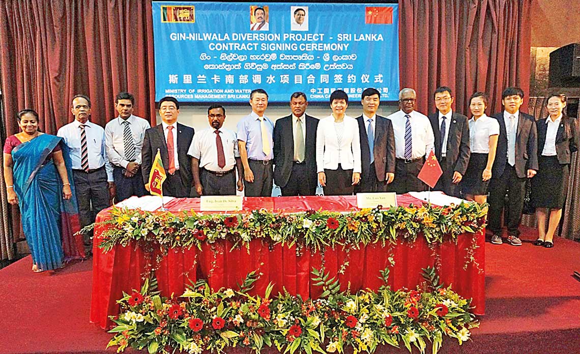 The Gin-Nilwala Diversion Project contract was signed on November 5, 2014 and 5% of the agreed fee was advanced as a mobilization payment soon after the agreement was signed between K.W. Ivan de Silva, of the Irrigation and Water Management Ministry, and Luo Yan, Chairman CAMC Engineering Company.