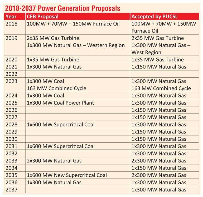 Since 2013, CEB submitted a number of Long-Term Generation Expansion Plans (LTGEP) for the approval of PUCSL, but they were not acceptable to the Commission. The CEB proposal for 2015-2034 proposed power generation almost exclusively with coal. The Commission pointed out errors in computations and requested corrections and also requested inclusion of locally-available or imported natural gas-fired plants as an alternative to coal-fired plants.