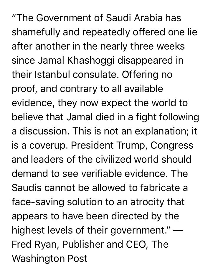 Fred Ryan, the paper’s publisher, said the Saudi government had “shamefully and repeatedly offered one lie after another.”