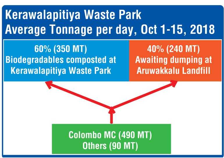 From March 2009 until the disaster of April 2016, CMC was sending unsorted waste to Meethotamulla with CMC incurring only the maintenance cost for the site. The estimates of CMC’s daily tonnage vary from 800-900 MT. The wonder of economic incentives is such that, after waste disposal was taken over by the ministry of Megapolis imposing differential fees, CMC found the motivation to reduce the waste to 490 MT per day on average plus separate 60% of waste as compostable food waste and other biodegradable to claim the lower dumping fee. Latest statistics from 1-15 October are given in the graphic.