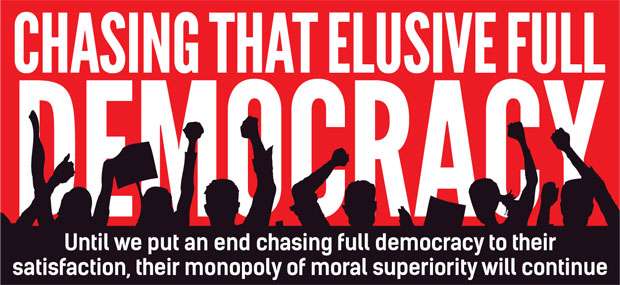 "Until and unless we wake up and put an end to this elusive dream of chasing the status of a “full democracy “ to their satisfaction, their monopoly of “moral superiority “ and preventing us from directing the destiny of our Nation will continue"