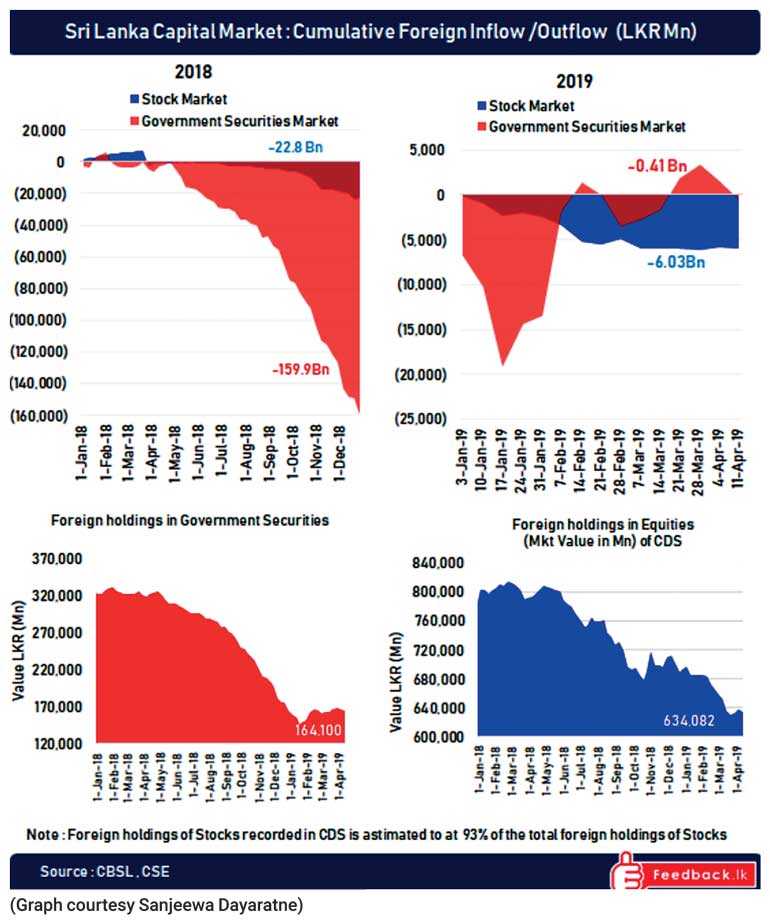 We have seen two unusual spurts in exchange rate depreciation once in the year 2012 (after many years of trying to peg the currency to show economic growth) with the budget proposal to devalue the currency by 3% overnight resulting in 12% depreciation in that year, thereafter the year 2018 52-day saga, bad communication of the debt repayment and forex traders making a quick buck out of the situation resulting over 19% depreciation (153.5 in Jan 2018 to 183 in Dec 2018, source https://www.bloomberg.com/quote/USDLKR:CUR). These are all manmade issues which were never in the interest of the country but of petty party politics. Sri Lanka lacks real FDI; instead what the country attracted was hot money to bond and equity markets. As per the graphs, the country vulnerability in terms of investments by foreigners in Sri Lanka is quite visible. So-called FDIs to Hambantota Port or roads and railroads of that nature from China came with conditions that the contractor must be a Chinese entity, consultants are from China, even those who worked on sites were Chinese. What does it mean? The loan given or the capital inflow goes back to China. How will the reserves improve with FDIs of this nature? We need real FDIs for increasing manufacturing capabilities and to reap benefits at the trade account level.