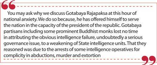 Gotabaya partisans including some prominent Buddhist monks lost no time in attributing the obvious intelligence failure, undoubtedly a serious governance issue, to a weakening of State intelligence units. That they reasoned was due to the arrests of some intelligence operatives for complicity in abductions, murder and extortion.