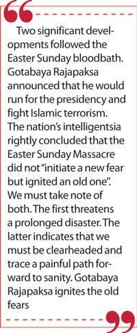 Two significant developments followed the Easter Sunday bloodbath. Gotabaya Rajapaksa announced that he would run for the presidency and fight Islamic terrorism.