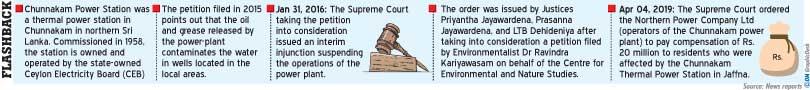 The Supreme Court ordered the Northern Power Company to pay Rs.20 million as compensation to the residents of the Chunnakam area, who reside within a 1.5 kilometre radius of the thermal power station and whose wells have been contaminated with Oil and Grease and/or BTEX.