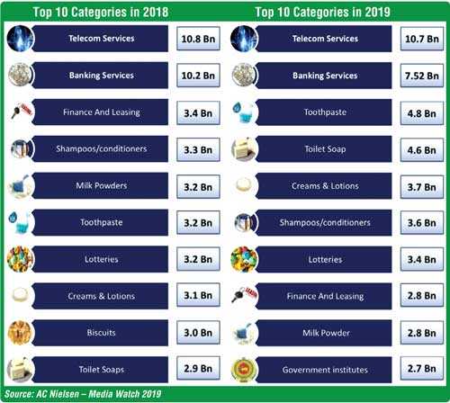 Telecom has kept its brand building initiative but banking services have cut its investment post the April attack. Incidentally, the financing and leasing sector is a casualty on the advertising front dropping from Rs. 3.4 billion investment to Rs. 2.8 billion in 2019 which is essentially due to the correlation the industry has with the tourism sector.