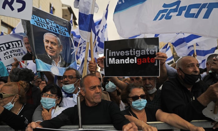 Israel’s attorney general, Avichai Mandelblit, who indicted Netanyahu, filed police complaints this month over what he said were coordinated death threats. At the pro-Netanyahu protest, a sign had been erected on which the attorney general’s face had been cut and pasted on to the image of a man in jail.