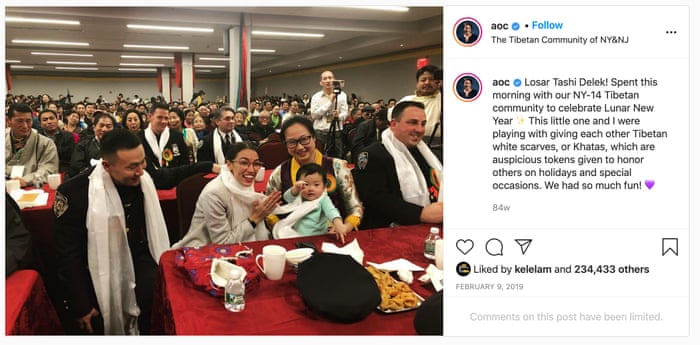 Baimadajie Angwang appears alongside Alexandria Ocasio-Cortez at a Tibetan New Year celebration. Photograph: Instagram/AOC