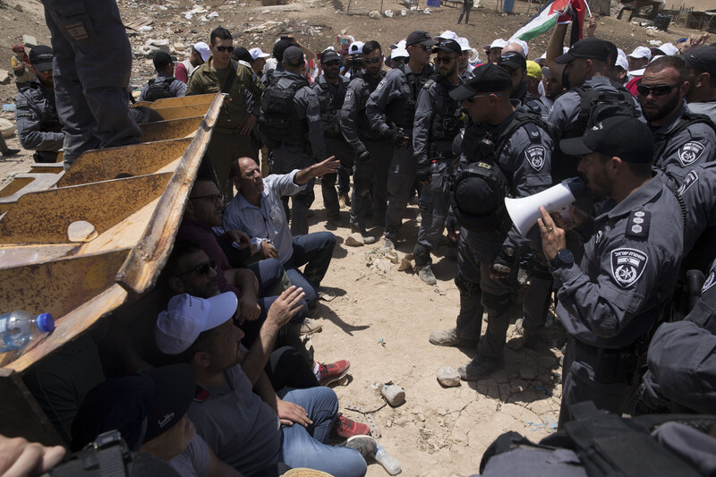Demonstrators block a bulldozer to prevent home demolitions in Khan al-Ahmar in 2018.