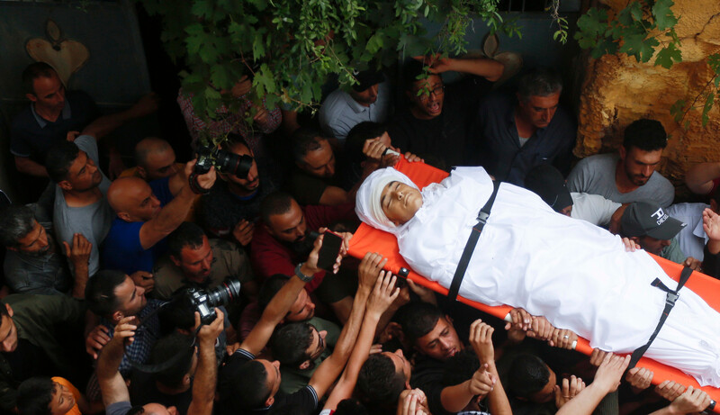 Mourners carry the body of 15-year-old Ahmad Bani-Shamsa on 17 June after he succumbed to wounds sustained the day before in Beita village near the occupied West Bank city of Nablus.